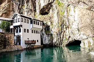 The Blagaj Tekke is a Dervish monastery (tekke) built at the dramatic source of the Buna River, where water emerges from a cave beneath a towering cliff. Established in the 15th century for the Halveti Sufi order, it is one of the most picturesque and spiritually significant sites in Bosnia. The building's Ottoman architecture seamlessly integrates with the natural landscape.